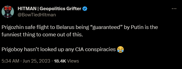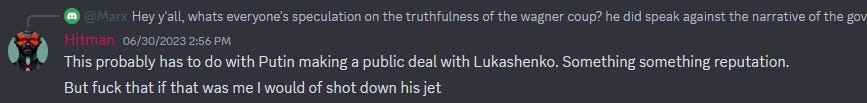 If you read this Substack or follow me on Twitter, Prigozhin’s death should not be a surprise to you. Prigozhin being alive was a blackeye to the Kremlin’s grip on power. He symbolized that you can shoot for the throne and live to tell the tale. Prigozin and other Wagner group leaders were on a jet from Moscow to St. Petersburg were they allegedly got shot down. Their deaths are confirmed, we’re not 1000% sure on the method but getting shot down is currently the prominent theory. Wagner leaders all traveling together is really an unwise thing to do. This is the reason why you’ll never see the US president and vice president on the same flight. These guys traveling together basically allowed the Kremlin to do a decapitation strike on the Wagner Group leadership.