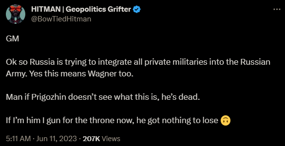 While writing articles I discovered something about myself. When I have enough data I’m second to none when it comes to analytical ability. When your data and analysis reach a certain level you can make scary accurate predictions sometimes. My most famous one was understanding Prigozhin’s situation and predicting the mad dash for Moscow.