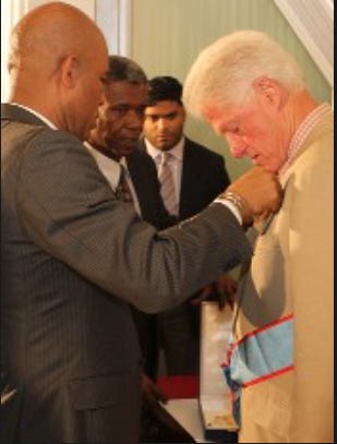 Candidate Martelly was supported by Bill Clinton who was UN Special Envoy to Haiti at the time. Martelly as president would go on to award Bill Clinton the National Order of Honour and Merit “for his various initiatives in Haiti and especially his high contribution to the reconstruction of the country after the earthquake of January 12, 2010”. Martelly also launched a Presidential Advisory Council that was co-chaired by Bill Clinton.