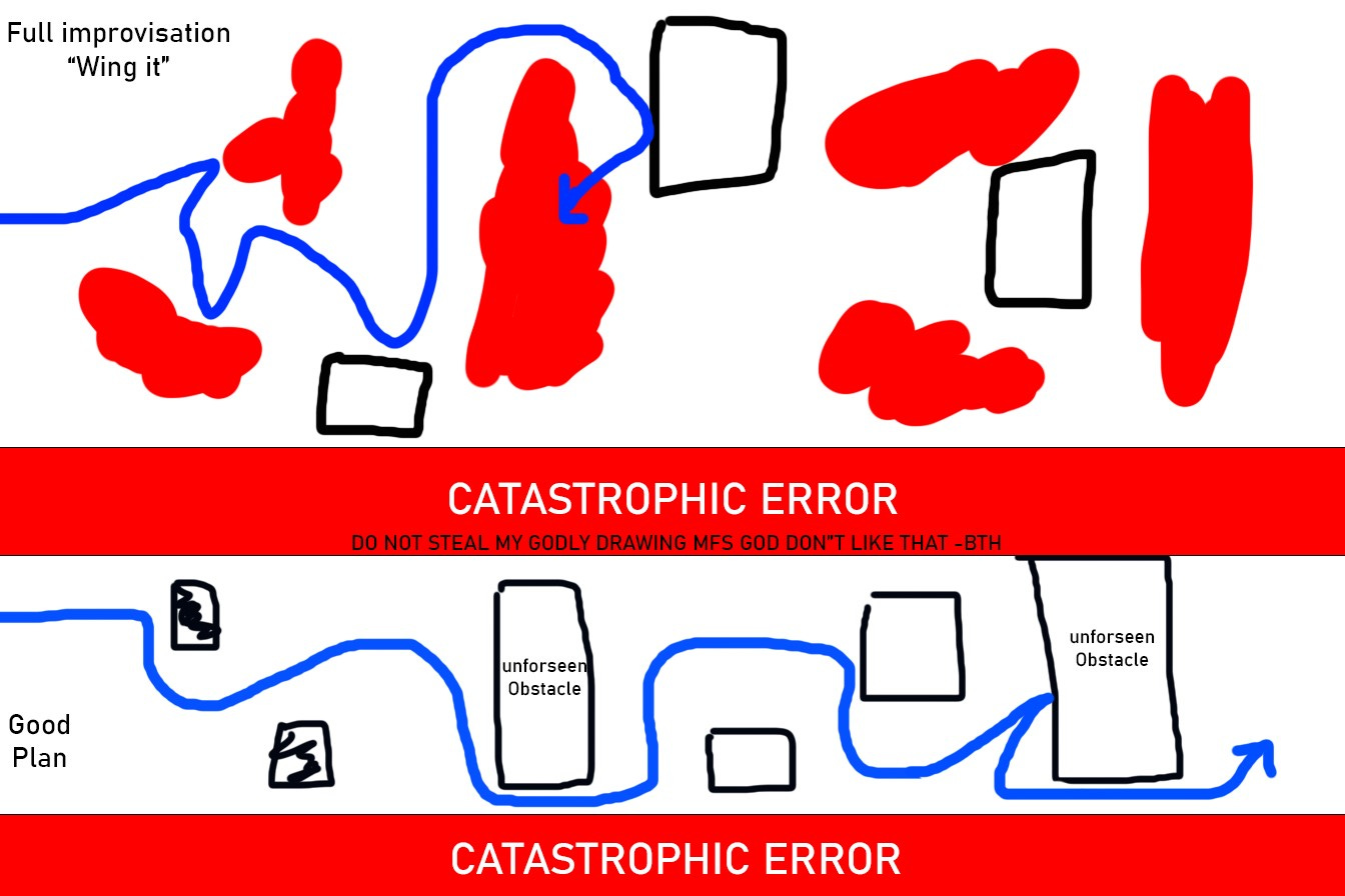 The top part of the drawing is showing you what happens when you just wing it vs when you have a good plan. As you can see when you have a good plan you’re laying out a path and with your research and experience you’re putting down your catastrophic error guardrails and your known obstacles. If you’re smart you noticed that both sides of the drawing have a constant, the improvisation line. Just because you have a plan does not mean you will not have to improvise. You’re actually improvising the whole way but in a more controlled manner. Remember what I said earlier, you can’t map your plan to reality 1:1, your goal is to get close enough. For most people an 80% plan should be good enough. Meaning your plan is 80% reality, the 20% you’ll just have to rely on your creativity and improvisation. This is the baseline but you can adjust based on your risk/speed appetite. Just remember that you should seldom ever try to get your plans above an 80% reality rate. Mapping anything 1:1 with reality is a physically impossible task, that’s how you get “paralysis by analysis”.