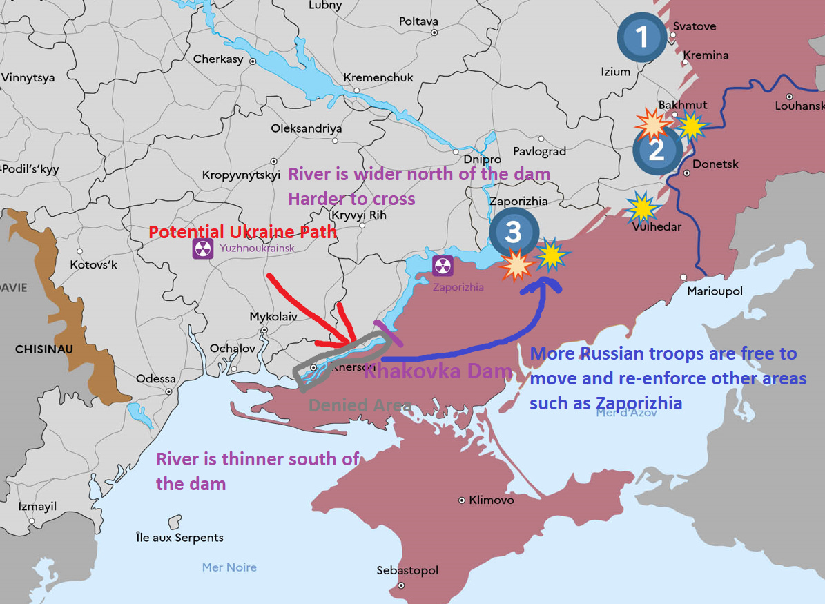 Russia wanted to give Ukraine less options when it comes to what directions they could push. So right after the Ukrainian offensive got underway, Russia allegedly blew up the Kakhovka Dam. The reason is to flood the areas downstream and make crossing the river more difficult, also the dam itself could of been used as a means to cross. Blowing it means the river is harder to cross so you need less troops to be in that area, that allows Russia the freedom to relocate those troops where they think they’ll need them more.